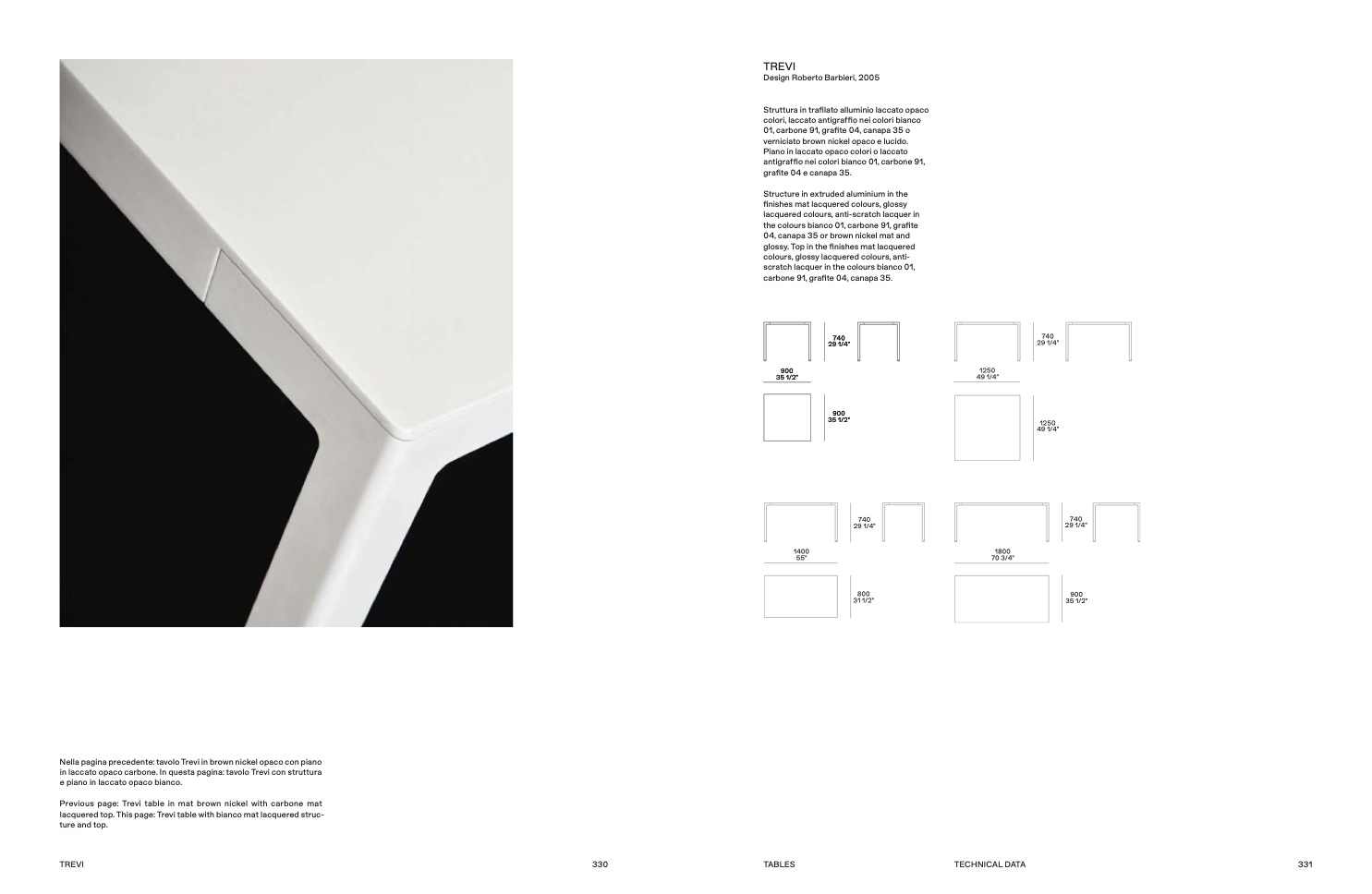 lacquered top. This page: Trevi table with bianco mat lacquered struc-