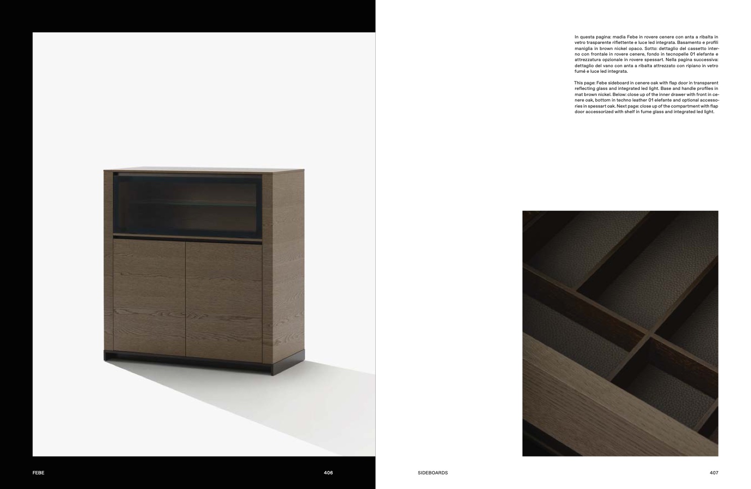 This page: Febe sideboard in cenere oak with flap door in transparent