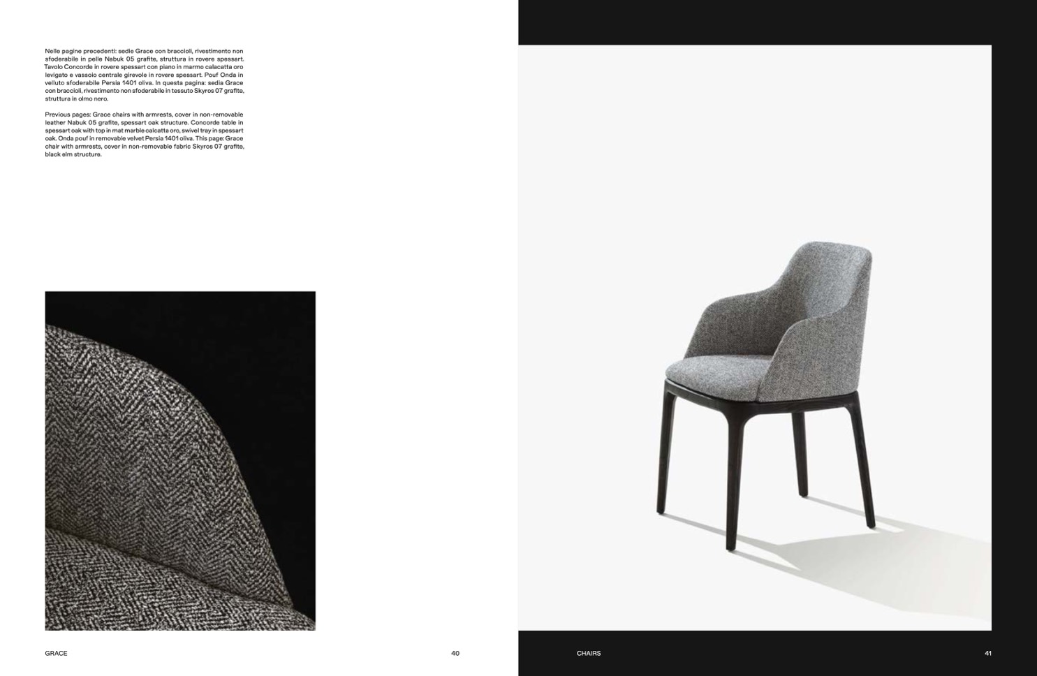 Nelle pagine precedenti: sedie Grace con braccioli, rivestimento non