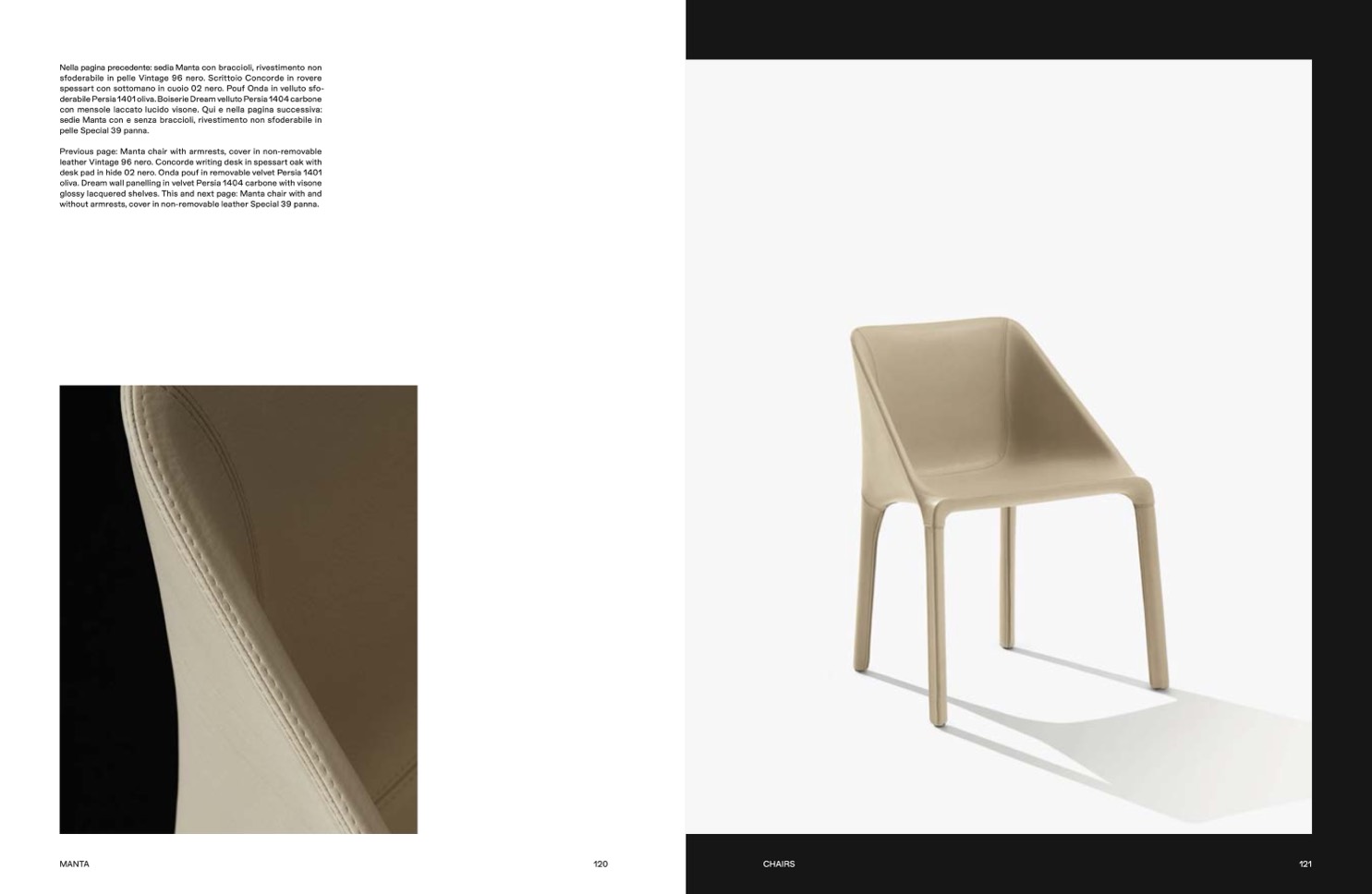 Nella pagina precedente: sedia Manta con braccioli, rivestimento non