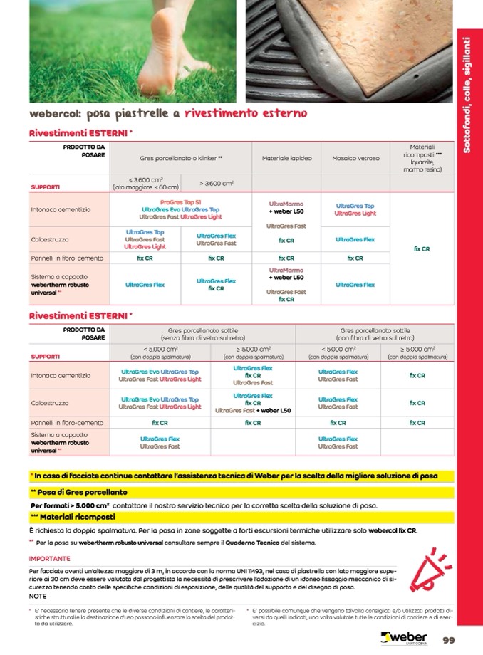 Per facciate aventi un’altezza maggiore di 3 m, in accordo con la norma UNI 11493, nel caso di piastrella con lato maggiore supe-