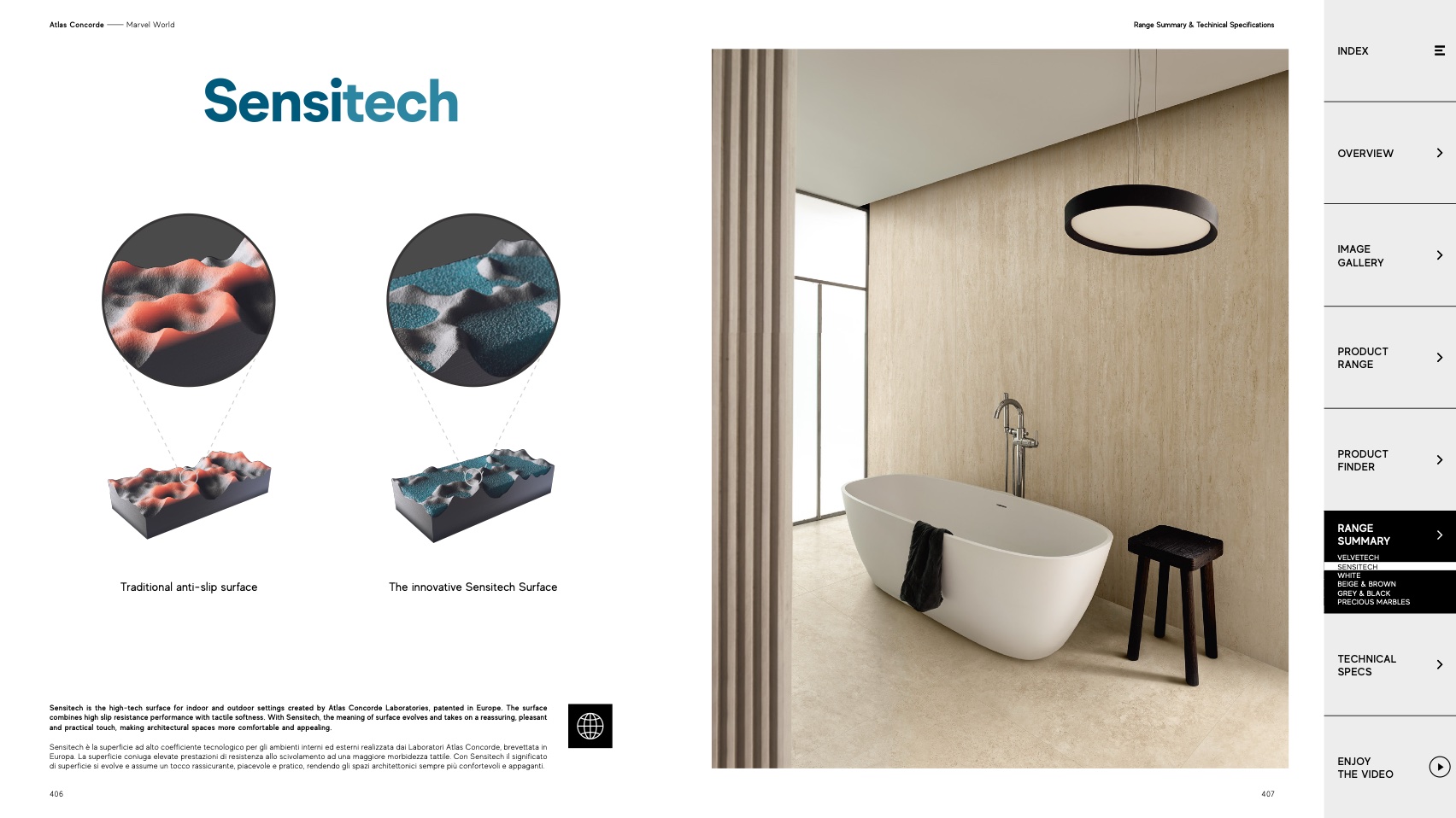 Sensitech è la superficie ad alto coefficiente tecnologico per gli ambienti interni ed esterni realizzata dai Laboratori Atlas Concorde, brevettata in