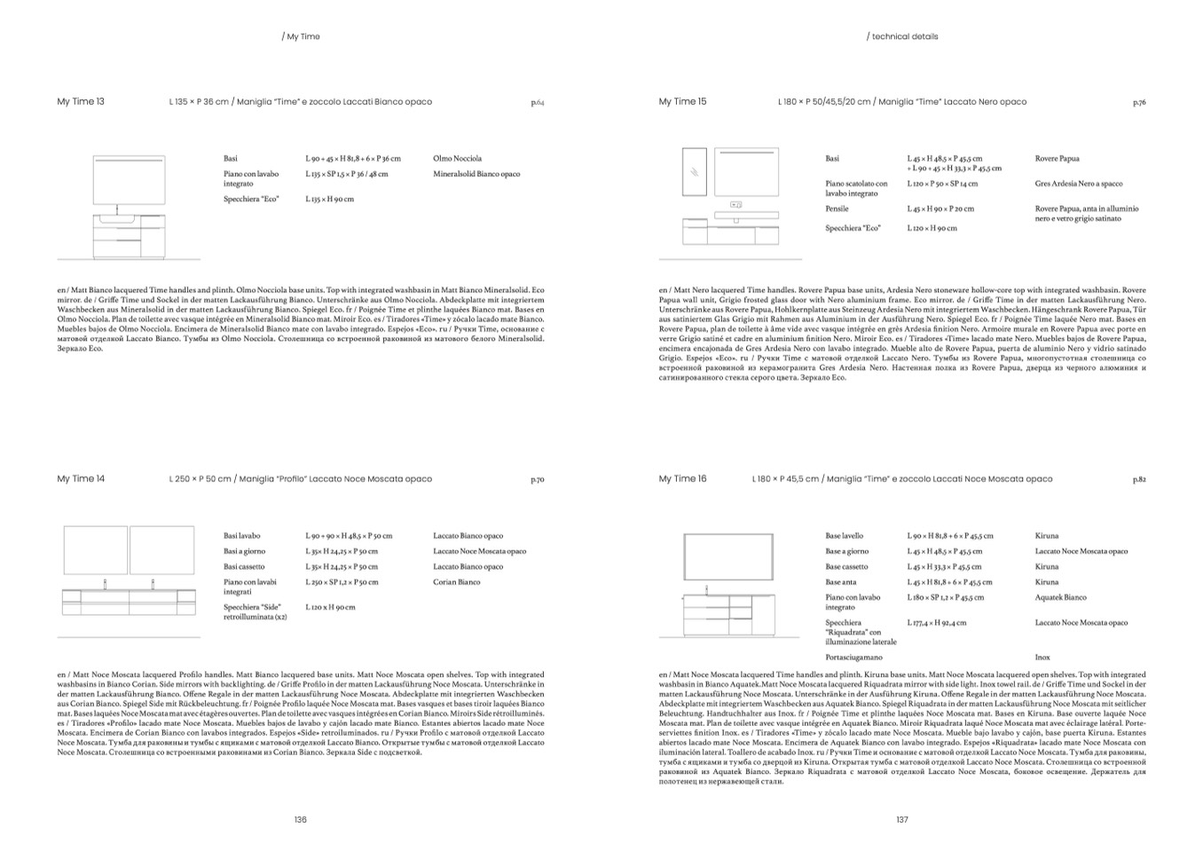 en / Matt Nero lacquered Time handles. Rovere Papua base units, Ardesia Nero stoneware hollow-core top with integrated washbasin. Rovere