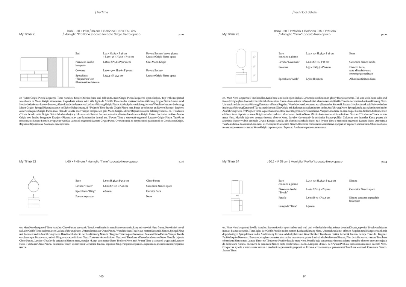 en / Matt Nero lacquered Time handles. Kena base unit with open shelves. Lavamani washbasin in glossy Bianco ceramic. Tall unit with Kena sides and