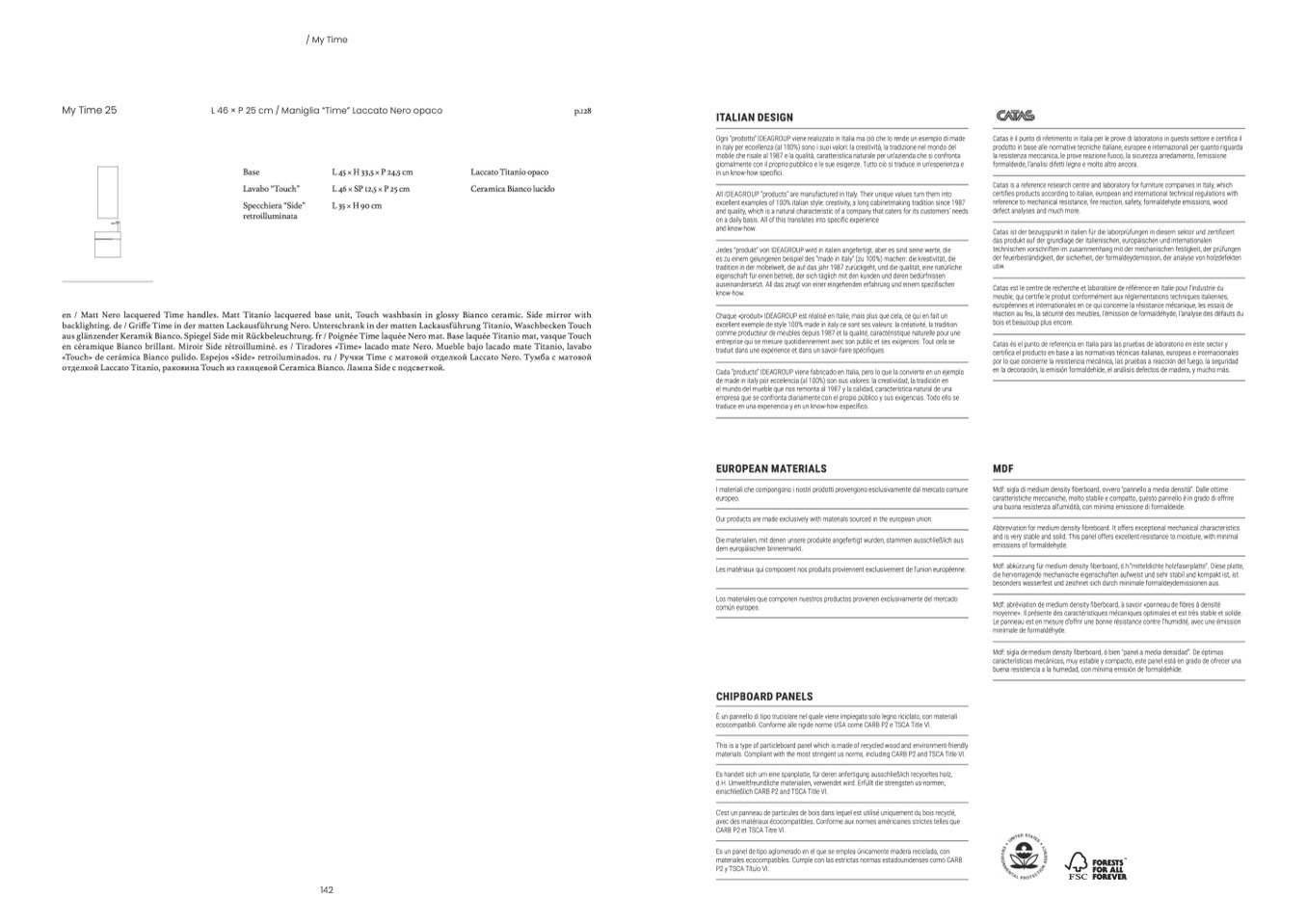 aus glänzender Keramik Bianco. Spiegel Side mit Rückbeleuchtung. fr / Poignée Time laquée Nero mat. Base laquée Titanio mat, vasque Touch