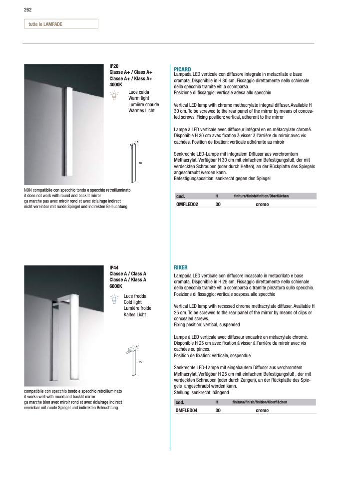 Vertical LED lamp with recessed chrome methacrylate diffuser. Available H