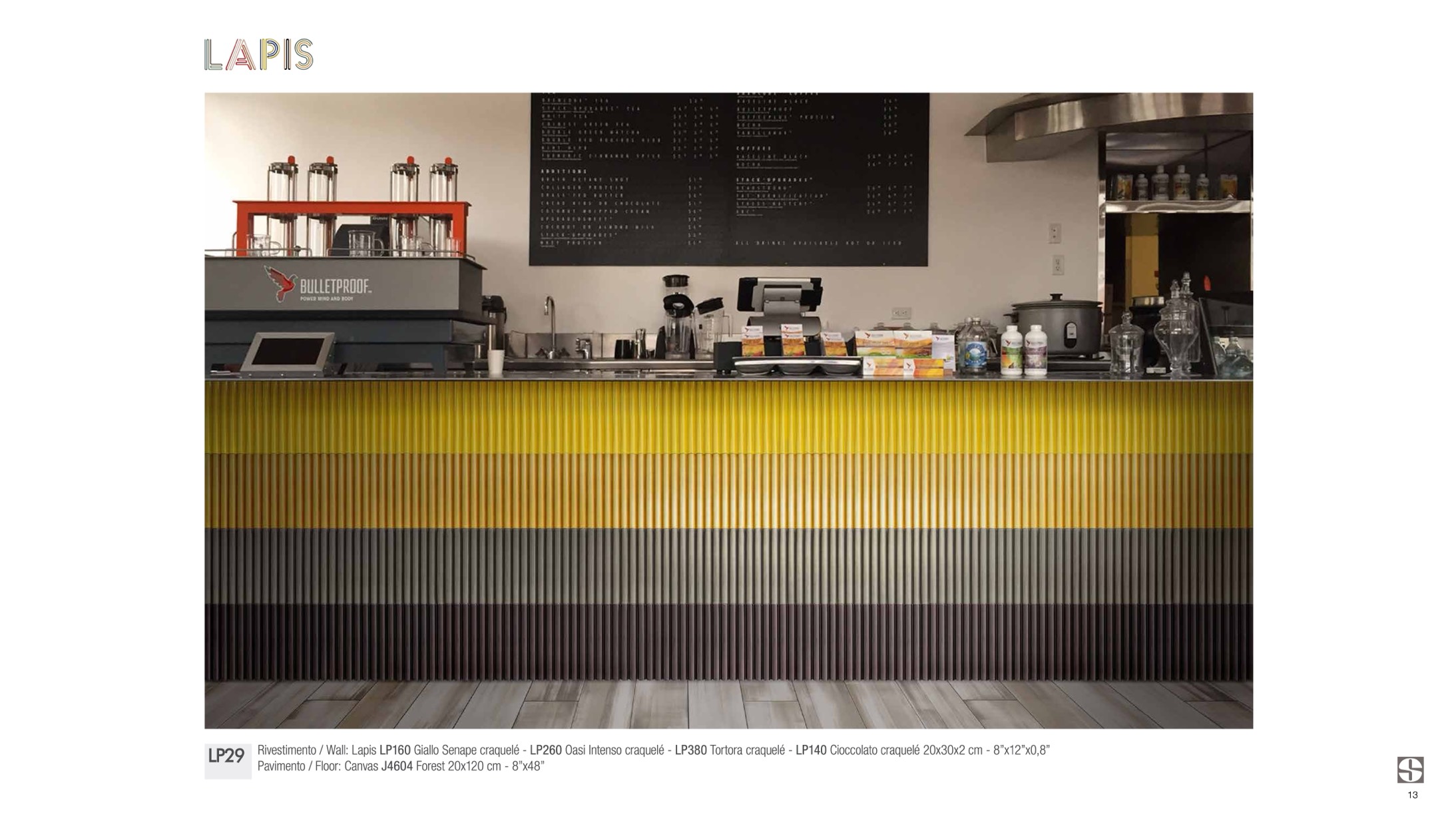 Rivestimento / Wall: Lapis LP160 Giallo Senape craquelé - LP260 Oasi Intenso craquelé - LP380 Tortora craquelé - LP140 Cioccolato craquelé 20x30x2 cm - 8”x12”x0,8”
