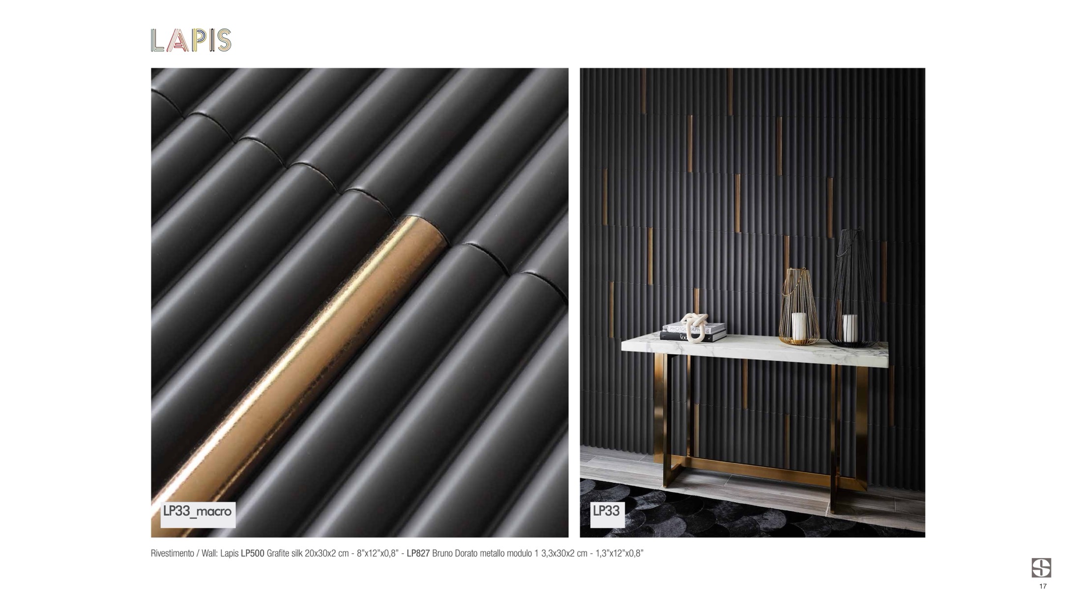 Rivestimento / Wall: Lapis LP500 Grafite silk 20x30x2 cm - 8”x12”x0,8” - LP827 Bruno Dorato metallo modulo 1 3,3x30x2 cm - 1,3”x12”x0,8”