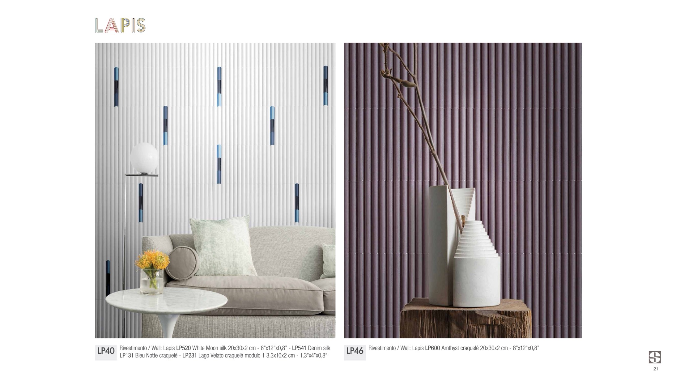 Rivestimento / Wall: Lapis LP520 White Moon silk 20x30x2 cm - 8”x12”x0,8” - LP541 Denim silk