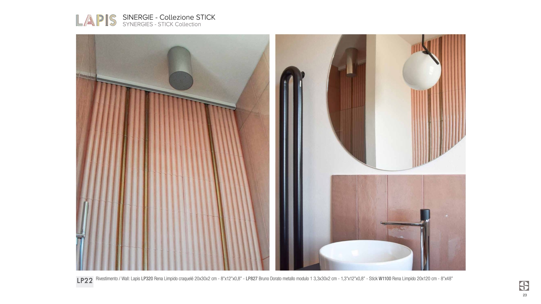 Rivestimento / Wall: Lapis LP320 Rena Limpido craquelé 20x30x2 cm - 8”x12”x0,8” - LP827 Bruno Dorato metallo modulo 1 3,3x30x2 cm - 1,3”x12”x0,8” - Stick W1100 Rena Limpido 20x120 cm - 8”x48”