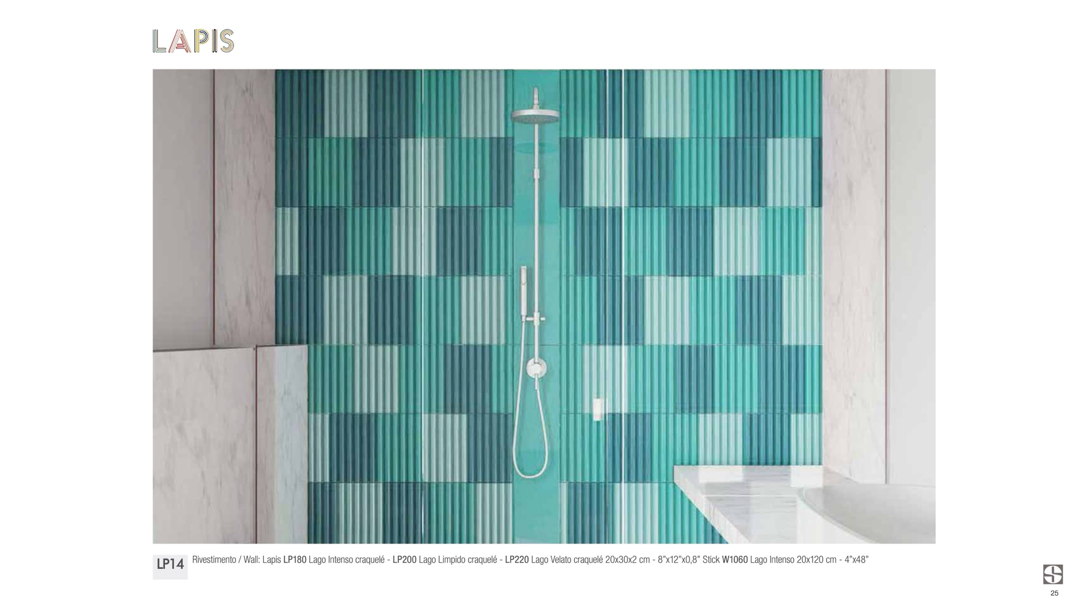 Rivestimento / Wall: Lapis LP180 Lago Intenso craquelé - LP200 Lago Limpido craquelé - LP220 Lago Velato craquelé 20x30x2 cm - 8”x12”x0,8” Stick W1060 Lago Intenso 20x120 cm - 4”x48”