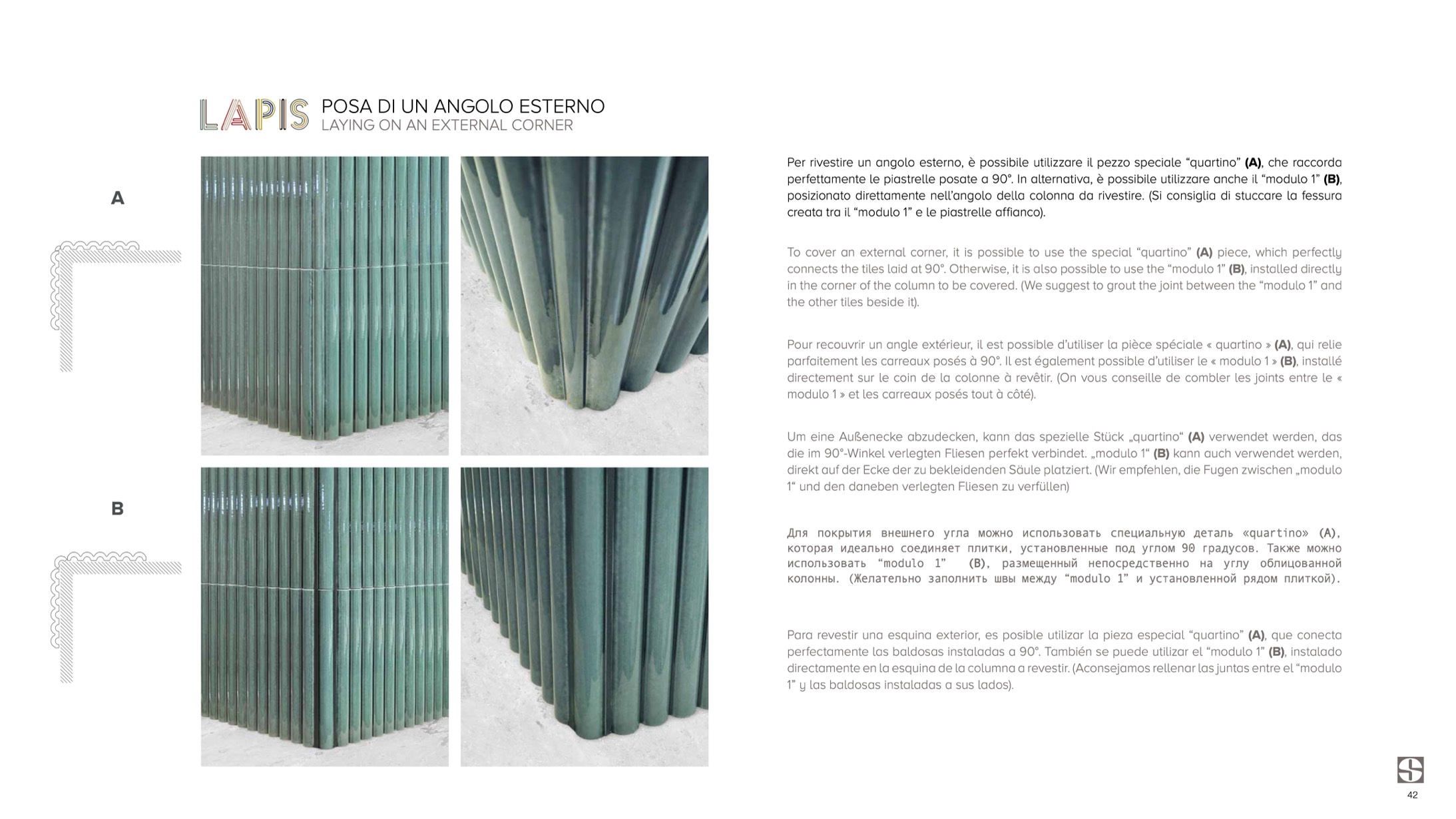 To cover an external corner, it is possible to use the special “quartino” (A) piece, which perfectly