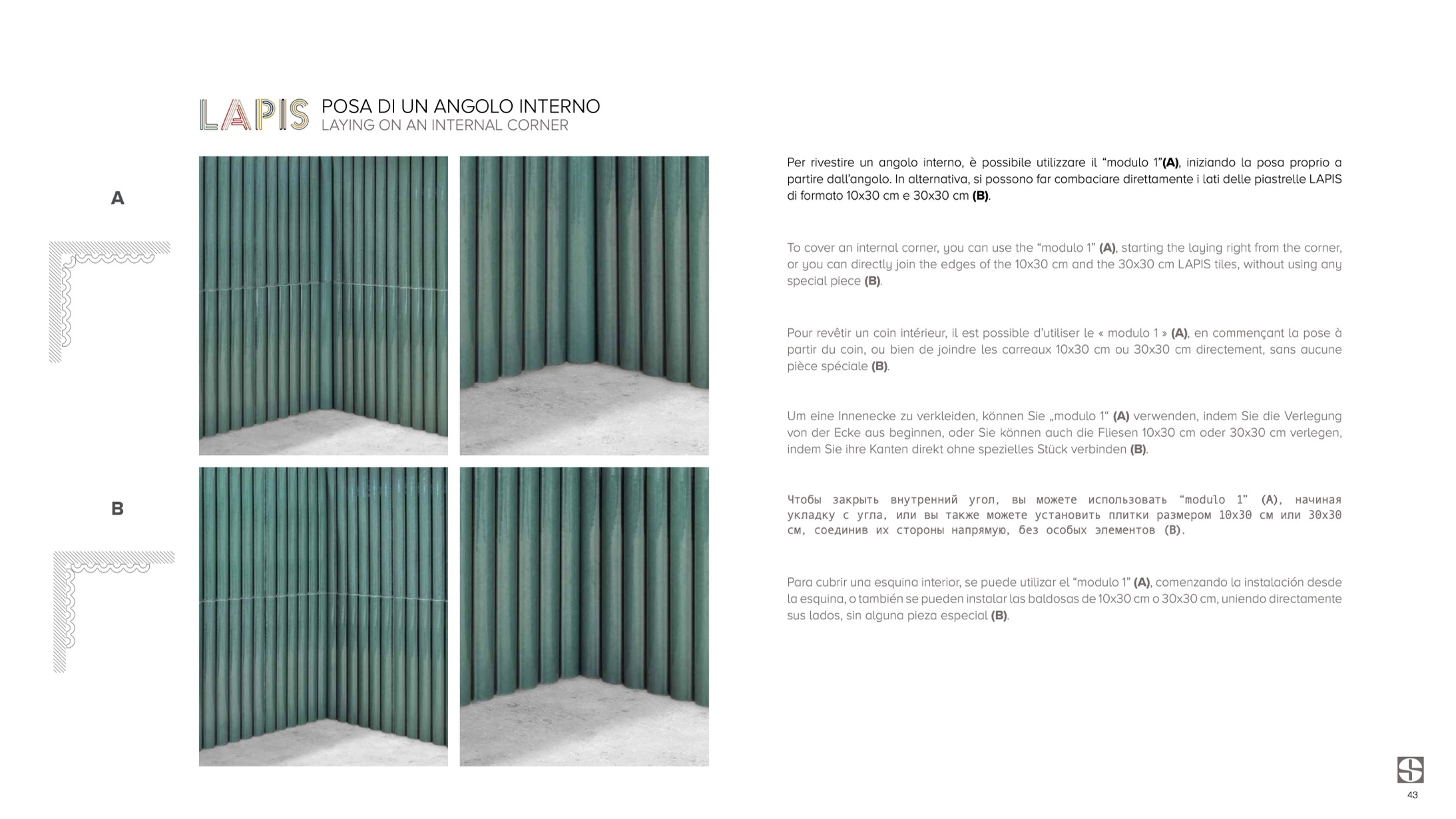 To cover an internal corner, you can use the “modulo 1” (A), starting the laying right from the corner,