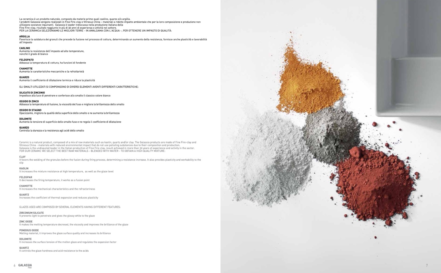 Ceramic is a natural product, composed of a mix of raw materials such as kaolin, quartz and/or clay. The Galassia products are made of Fine Fire-clay and
