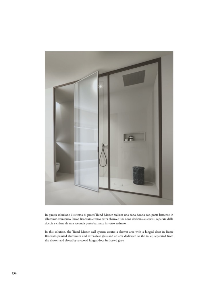 Bronzato painted aluminum and extra-clear glass and an area dedicated to the toilet, separated from