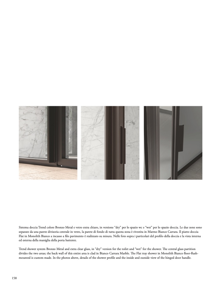 Trend shower system Bronzo Metal and extra clear glass, in “dry” version for the toilet and “wet” for the shower. The central glass partition