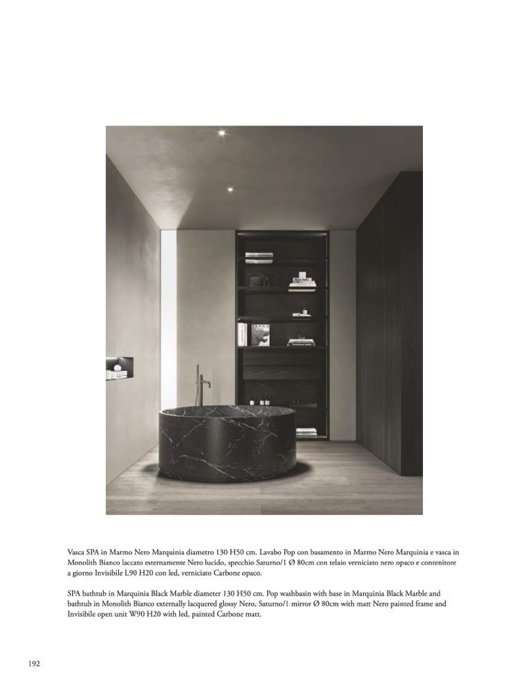bathtub in Monolith Bianco externally lacquered glossy Nero, Saturno/1 mirror Ø 80cm with matt Nero painted frame and
