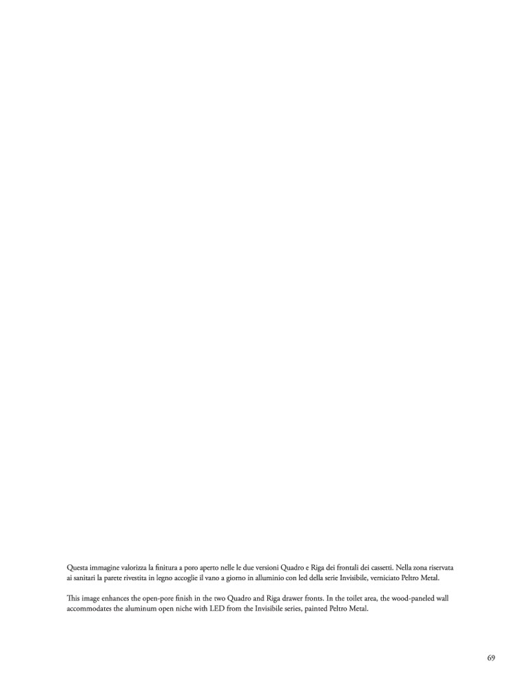 Questa immagine valorizza la finitura a poro aperto nelle le due versioni Quadro e Riga dei frontali dei cassetti. Nella zona riservata