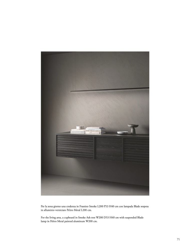 Per la zona giorno una credenza in Frassino Smoke L200 P53 H40 cm con lampada Blade sospesa