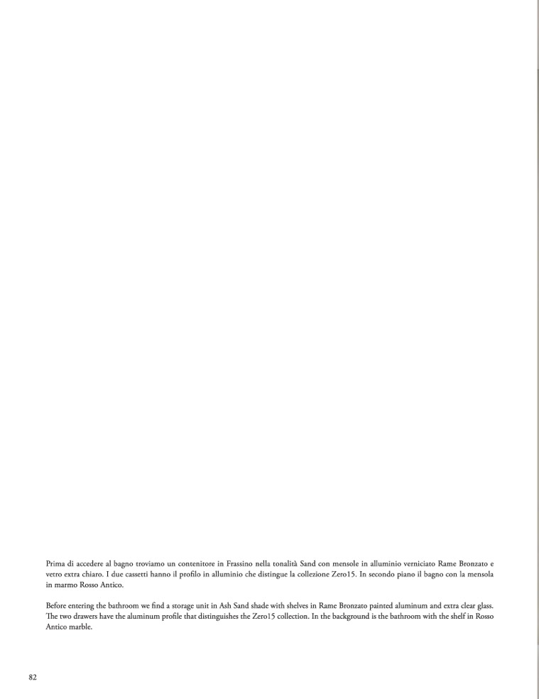 vetro extra chiaro. I due cassetti hanno il profilo in alluminio che distingue la collezione Zero15. In secondo piano il bagno con la mensola