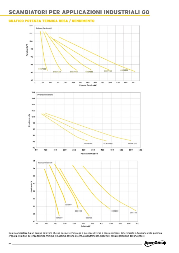 Ogni scambiatore ha un campo di lavoro che ne permette l'impiego a potenze diverse e con rendimenti differenziati in funzione della potenza