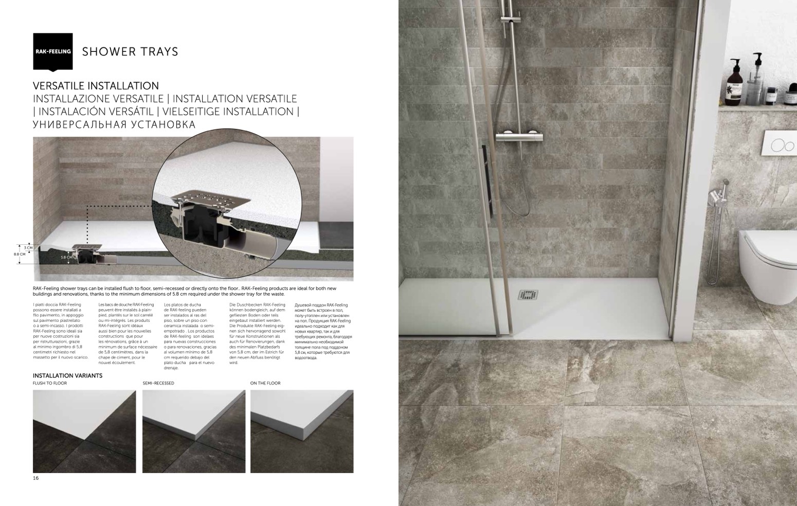 RAK-Feeling shower trays can be installed flush to floor, semi-recessed or directly onto the floor.. RAK-Feeling products are ideal for both new