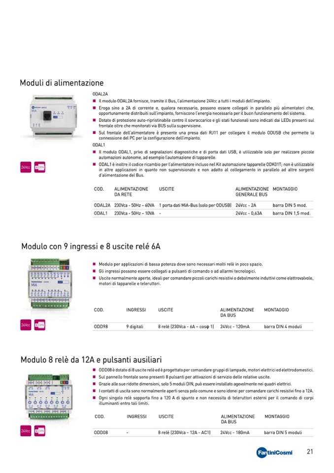 Il modulo ODAL2A fornisce, tramite il Bus, l’alimentazione 24Vcc a tutti i moduli dell’impianto.