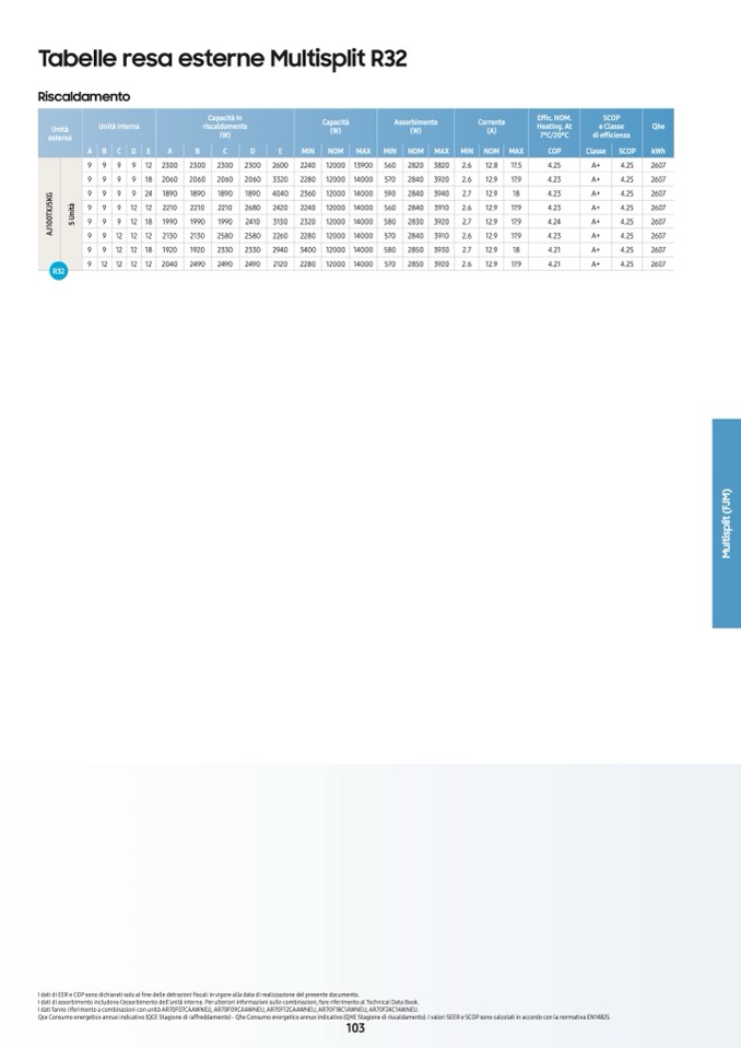 Qce Consumo energetico annuo indicativo (QCE Stagione di raffreddamento) - Qhe Consumo energetico annuo indicativo (QHE Stagione di riscaldamento). I valori SEER e SCOP sono calcolati in accordo con la normativa EN14825.