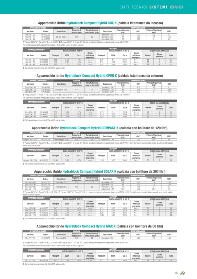 1) T. acqua 35/30° C - T aria 7° C (b.s.), U.R. 85% / 2) T. acqua 18/23° C - T. aria 35° C (b.s.) - prestazioni ottenute nel rispetto della norma UNI EN 14511. Per i dati tecnici completi della pompa di calore e delle caldaie