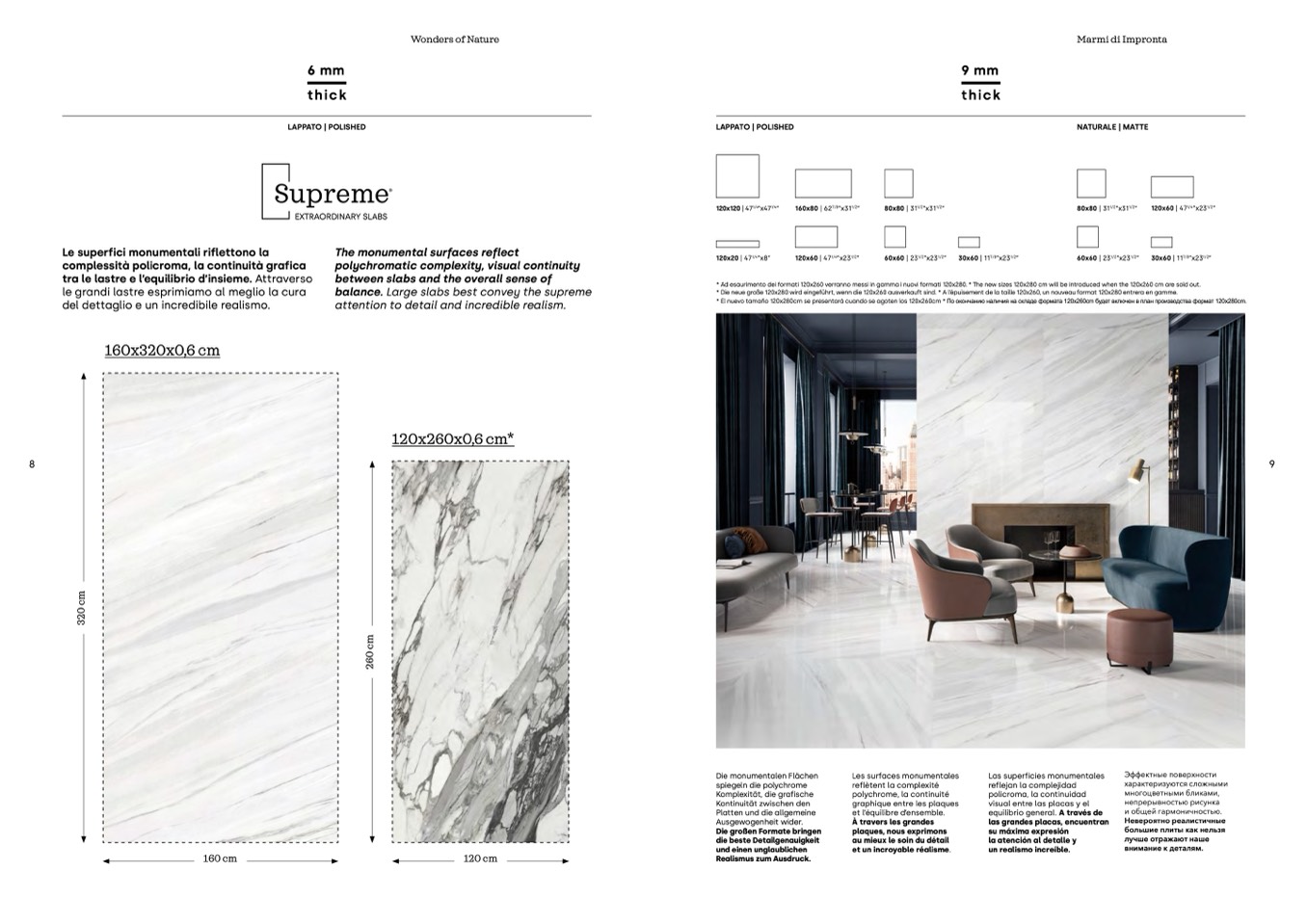 * Ad esaurimento dei formati 120x260 verranno messi in gamma i nuovi formati 120x280. * The new sizes 120x280 cm will be introduced when the 120x260 cm are sold out.