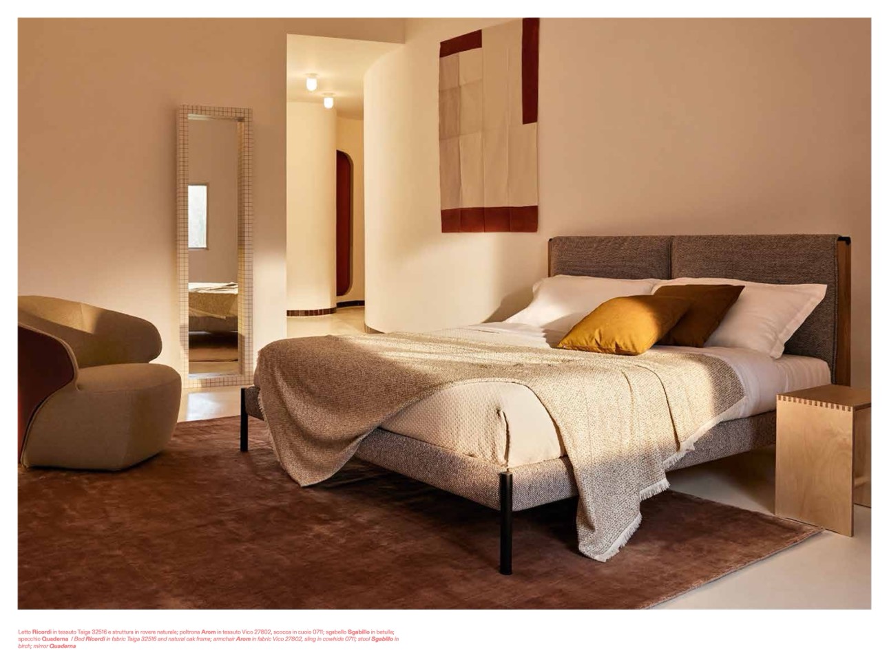 specchio Quaderna / Bed Ricordi in fabric Taiga 32516 and natural oak frame; armchair Arom in fabric Vico 27802, sling in cowhide 0711; stool Sgabillo in