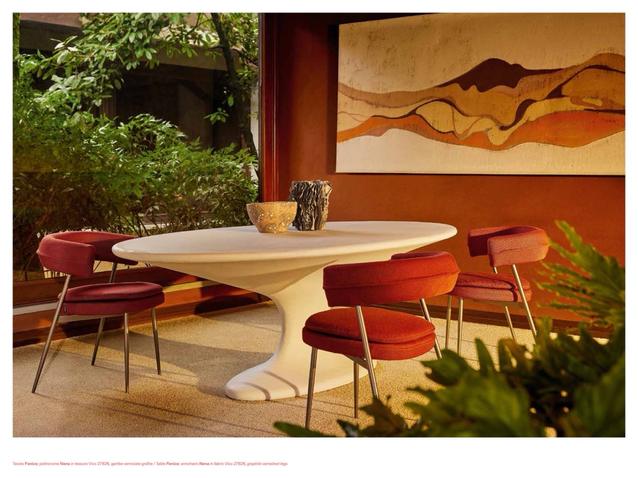 Tavolo Fenice; poltroncine Nena in tessuto Vico 27826, gambe verniciate grafite / Table Fenice; armchairs Nena in fabric Vico 27826, graphite varnished legs