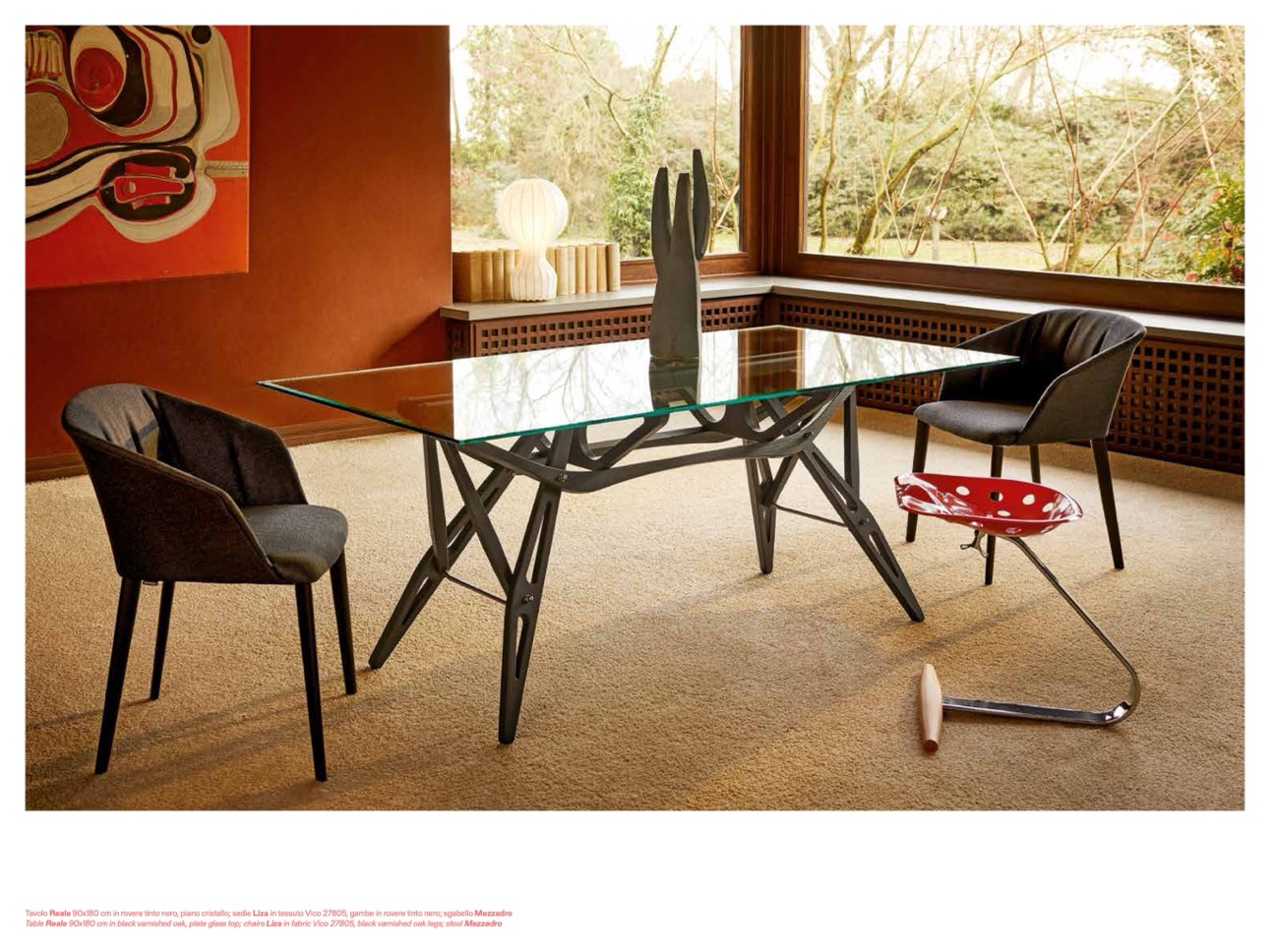 Table Reale 90x180 cm in black varnished oak, plate glass top; chairs Liza in fabric Vico 27805, black varnished oak legs; stool Mezzadro