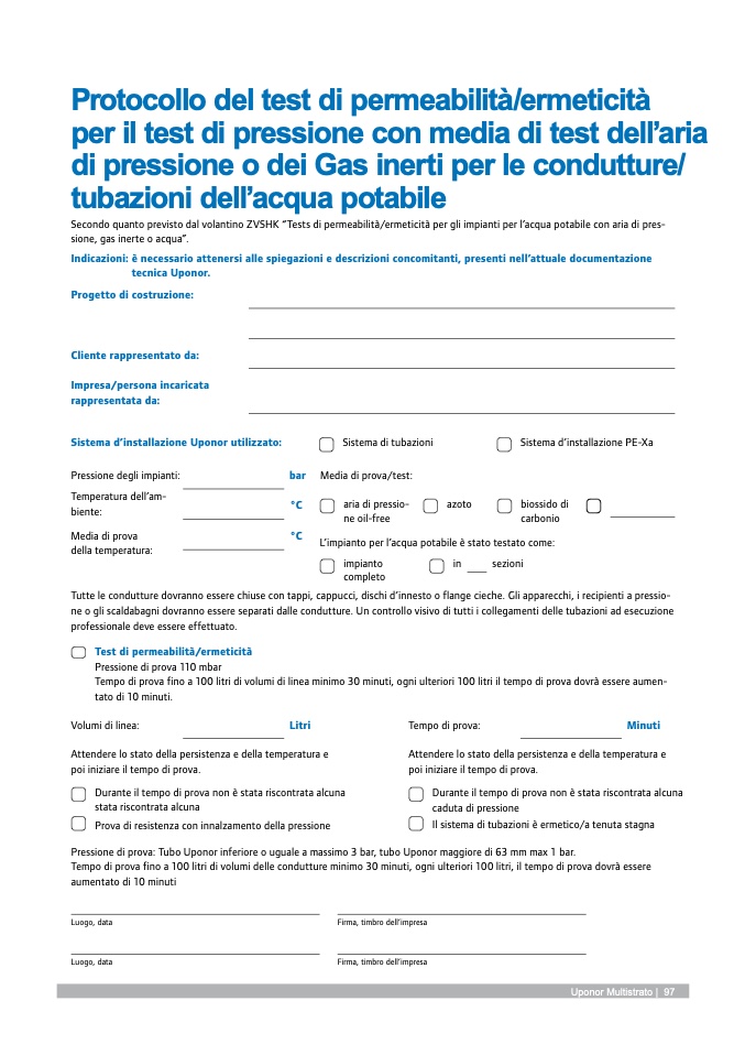 Secondo quanto previsto dal volantino ZVSHK “Tests di permeabilità/ermeticità per gli impianti per l’acqua potabile con aria di pres-