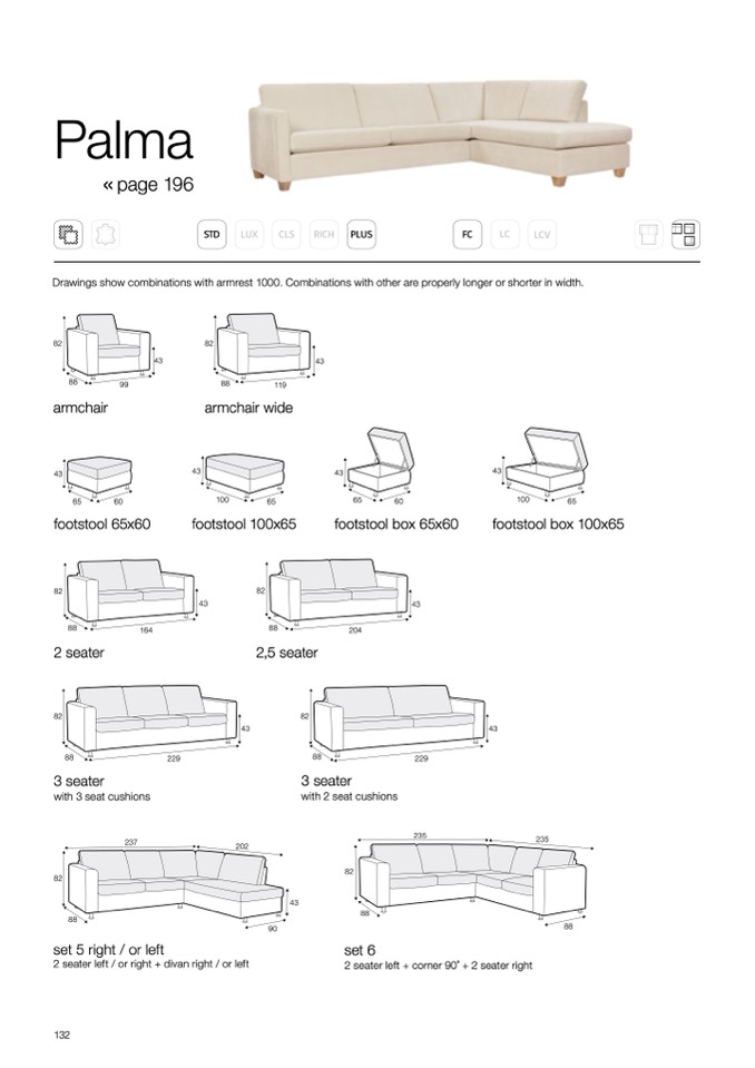 Drawings show combinations with armrest 1000. Combinations with other are properly longer or shorter in width.