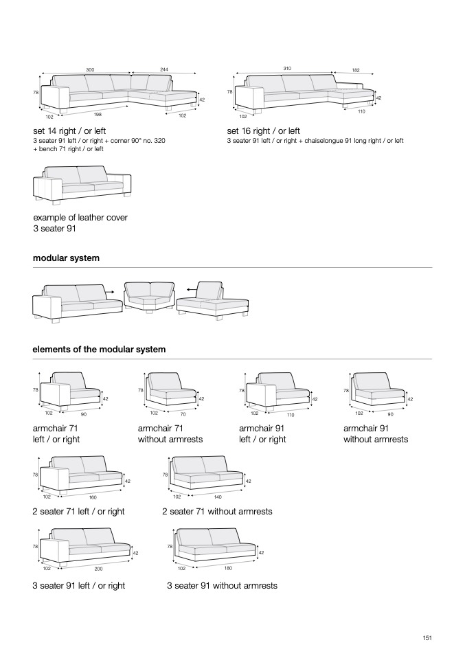 3 seater 91 left / or right + chaiselongue 91 long right / or left