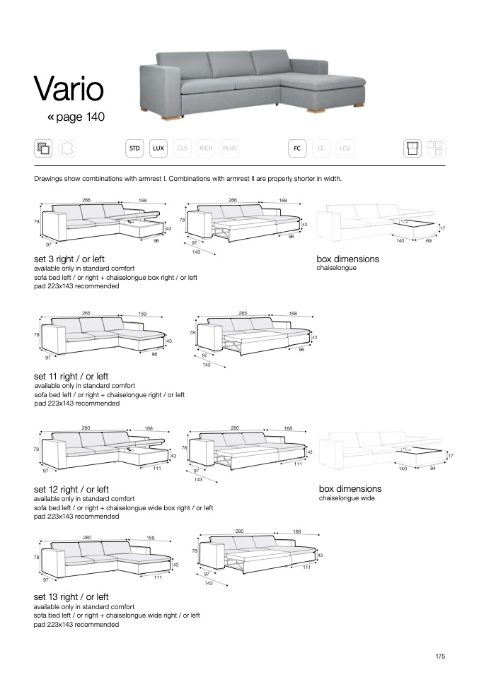 Drawings show combinations with armrest I. Combinations with armrest II are properly shorter in width.