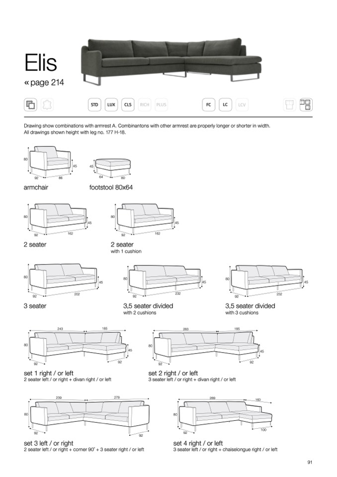 Drawing show combinations with armrest A. Combinantons with other armrest are properly longer or shorter in width.