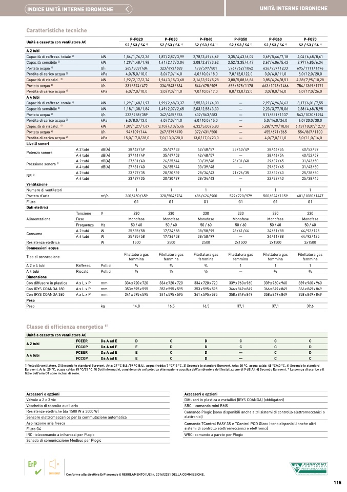 1) Velocità ventilatore. 2) Secondo lo standard Eurovent. Aria: 27 °C B.S./19 °C B.U., acqua fredda: 7 °C/12 °C. 3) Secondo lo standard Eurovent. Aria: 20 °C, acqua calda: 45 °C/40 °C. 4) Secondo lo standar