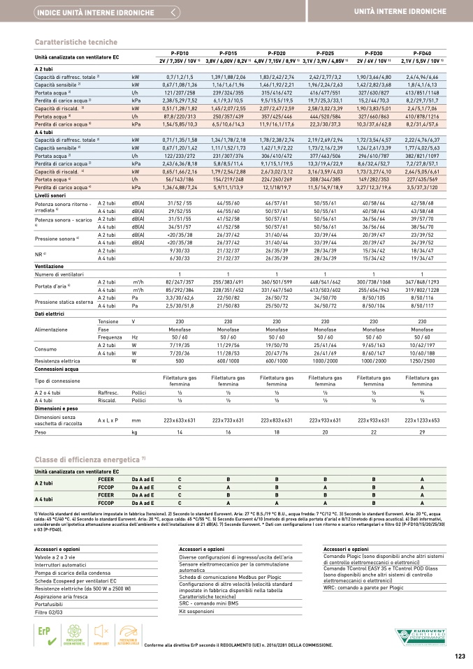 considerando un'ipotetica attenuazione acustica dell'ambiente e dell'installazione di 21 dB(A). 7) Secondo Eurovent. * Dati con configurazione I con ritorno e scarico rettangolari e filtro G2 (P-FD10/15/20/25/30