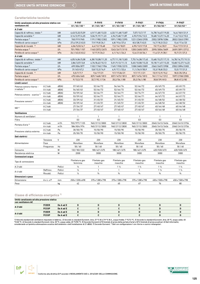 1) Velocità standard del ventilatore impostate in fabbrica. 2) Secondo lo standard Eurovent. Aria: 27 °C B.S./19 °C B.U., acqua fredda: 7 °C/12 °C. 3) Secondo lo standard Eurovent. Aria: 20 °C, acqua calda: 45