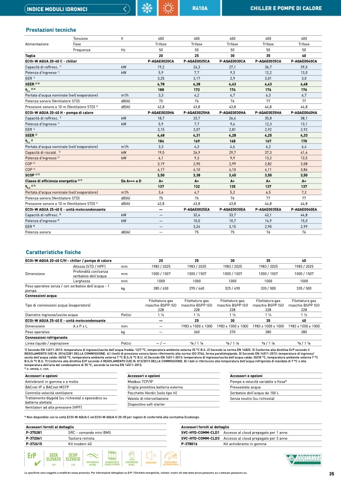 1) Secondo EN 14511-2013: temperatura di ingresso/uscita dell'acqua fredda: 12/7 °C, temperatura ambiente esterna 35 °C B.S. 2) Secondo la norma EN 14825. 3) Conforme alla direttiva ErP secondo il