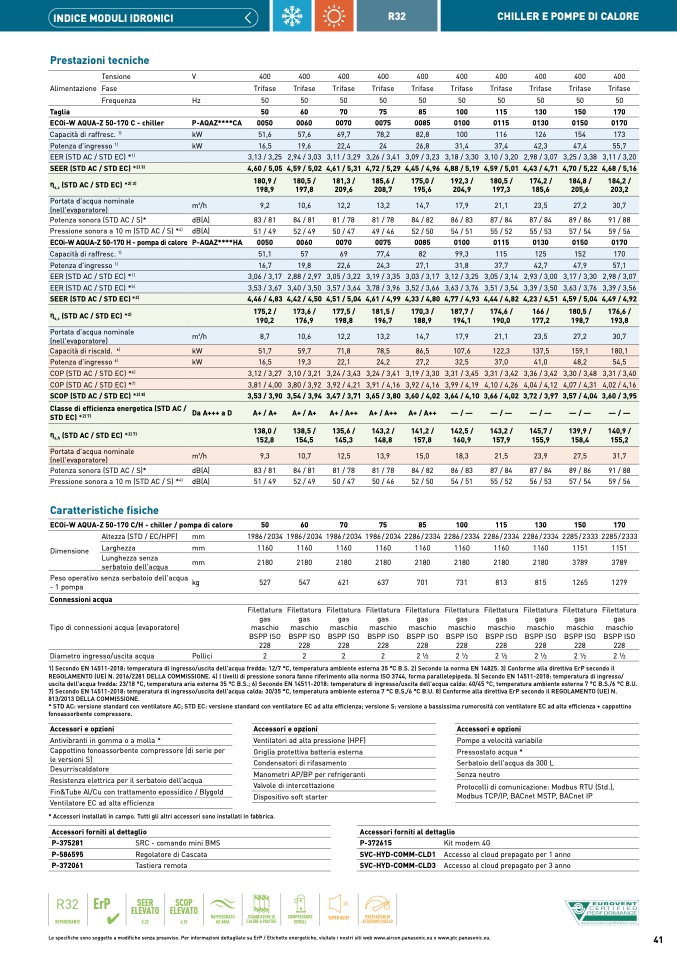 1) Secondo EN 14511-2018: temperatura di ingresso/uscita dell'acqua fredda: 12/7 °C, temperatura ambiente esterna 35 °C B.S. 2) Secondo la norma EN 14825. 3) Conforme alla direttiva ErP secondo i