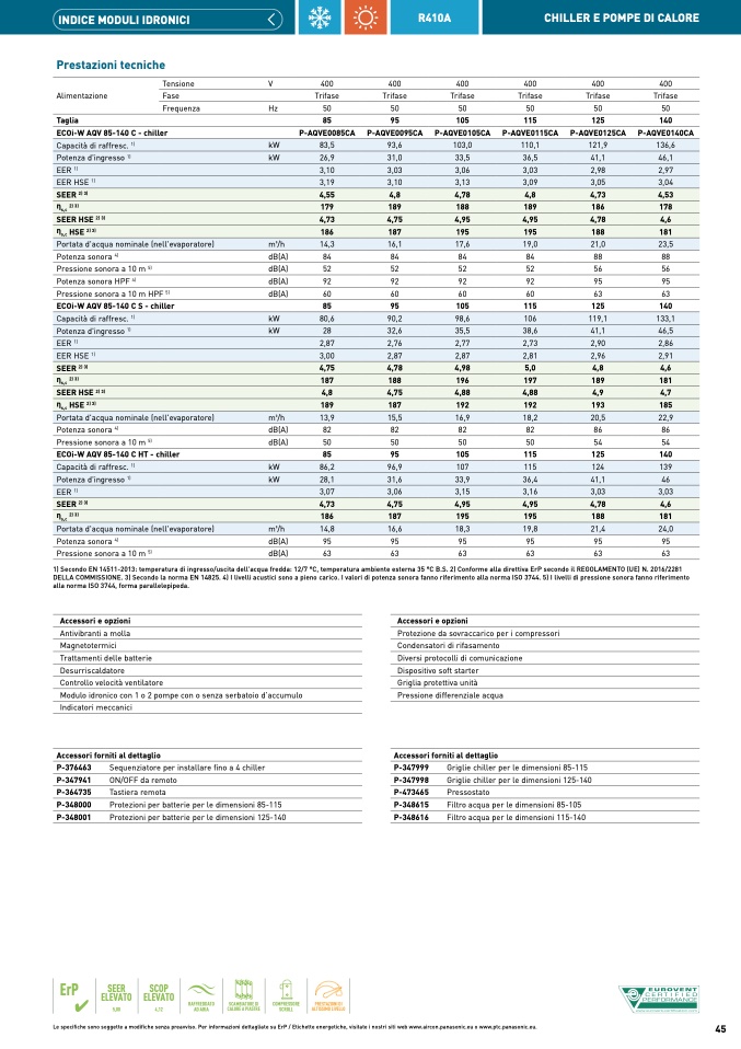 1) Secondo EN 14511-2013: temperatura di ingresso/uscita dell'acqua fredda: 12/7 °C, temperatura ambiente esterna 35 °C B.S. 2) Conforme alla direttiva ErP secondo il REGOLAMENTO (UE) N. 2016/2281
