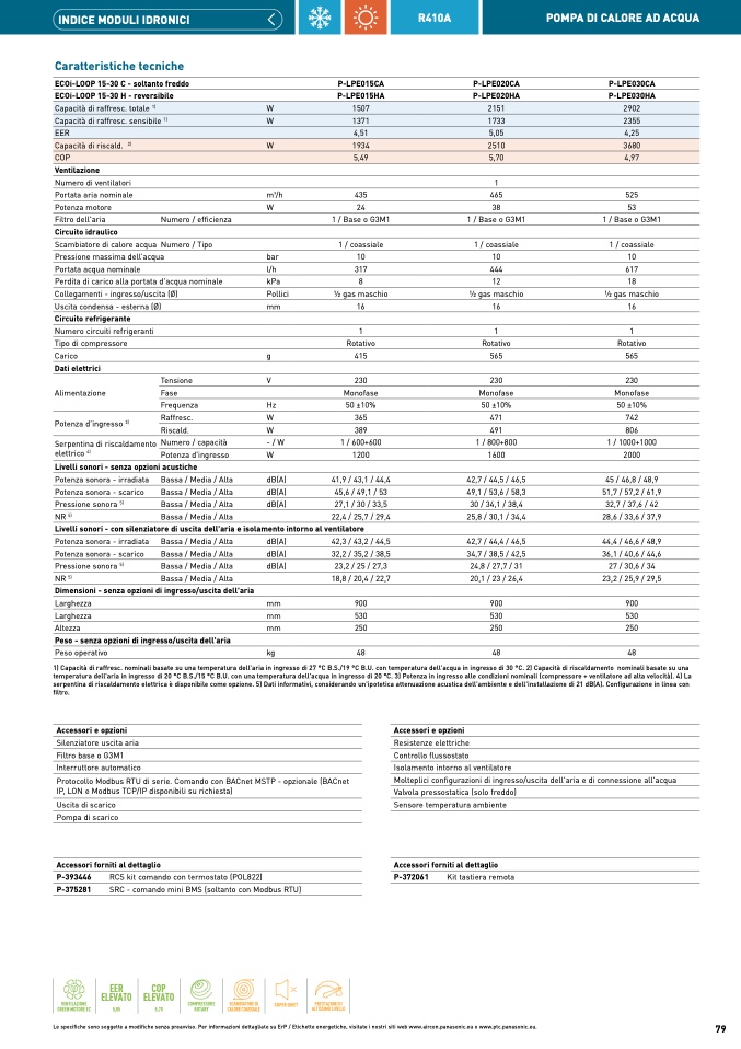 1) Capacità di raffresc. nominali basate su una temperatura dell'aria in ingresso di 27 °C B.S./19 °C B.U. con temperatura dell'acqua in ingresso di 30 °C. 2) Capacità di riscaldamento nominali basate su un