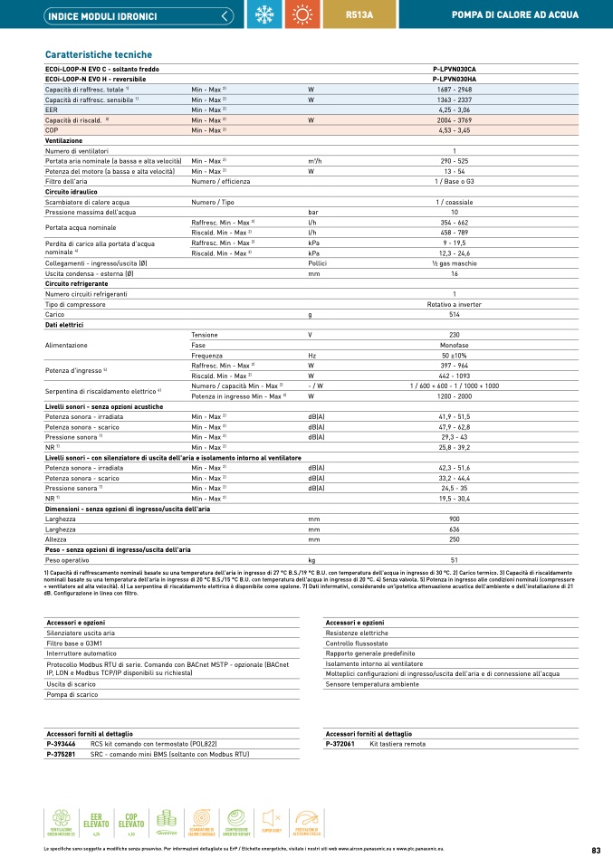 1) Capacità di raffrescamento nominali basate su una temperatura dell'aria in ingresso di 27 °C B.S./19 °C B.U. con temperatura dell'acqua in ingresso di 30 °C. 2) Carico termico. 3) Capacità di riscaldamento