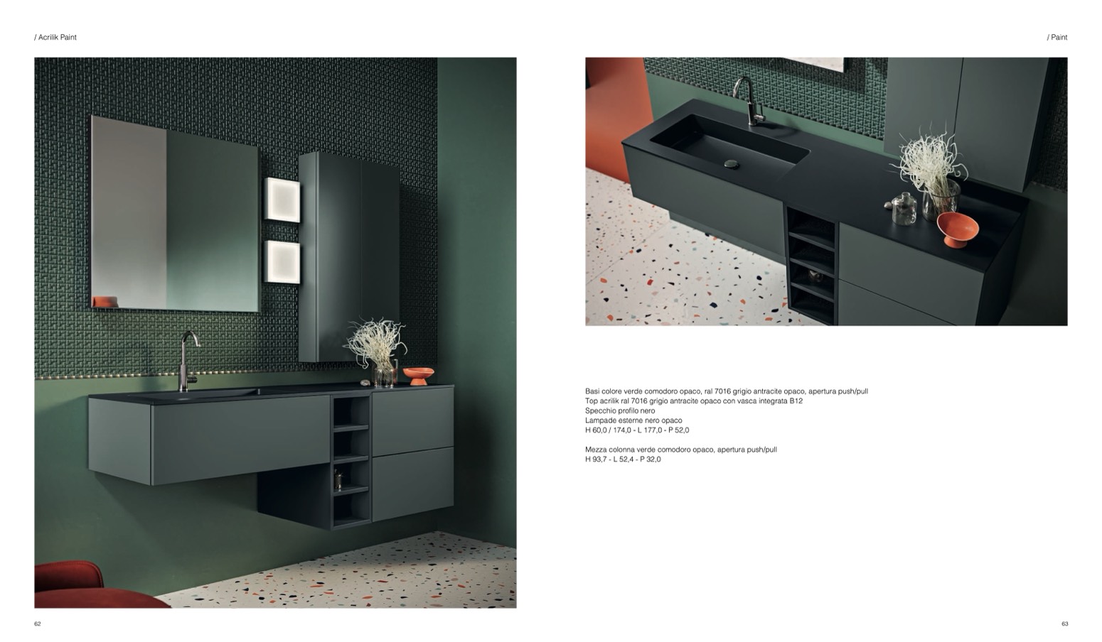 Basi colore verde comodoro opaco, ral 7016 grigio antracite opaco, apertura push/pull