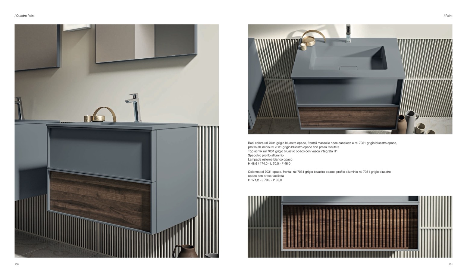 Basi colore ral 7031 grigio bluastro opaco, frontali massello noce canaletto e ral 7031 grigio bluastro opaco,