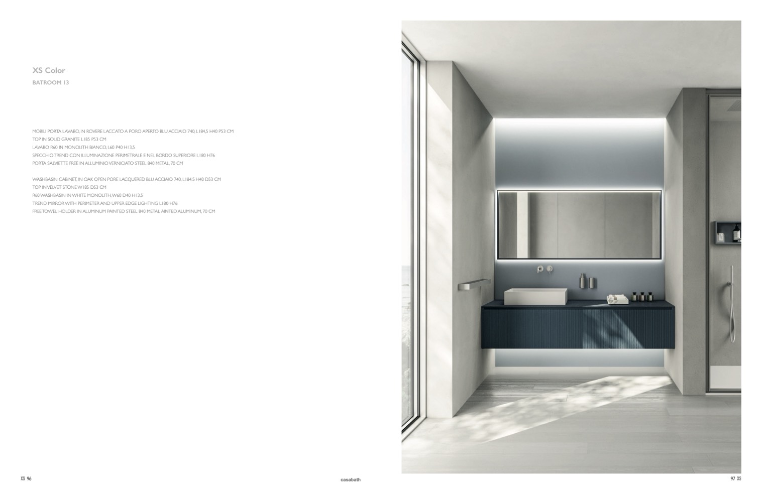 WASHBASIN CABINET, IN OAK OPEN PORE LACQUERED BLU ACCIAIO 740, L184.5 H40 D53 CM