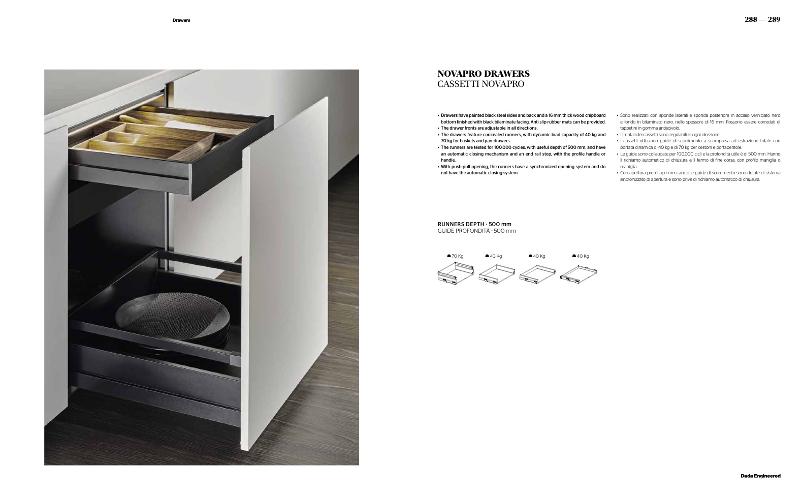 • The drawers feature concealed runners, with dynamic load capacity of 40 kg and